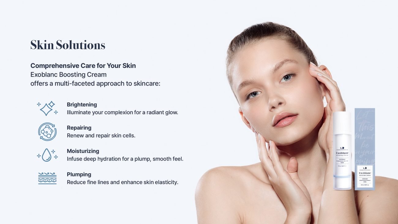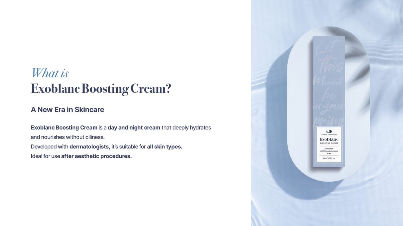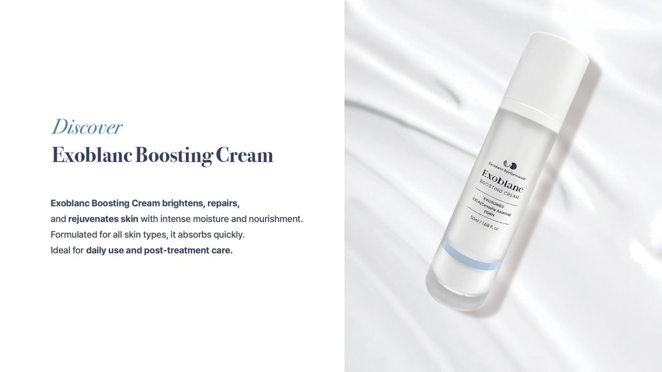 Exoblanc Boosting Cream is a lightweight day and night cream that deeply hydrates, brightens, and repairs skin, making it ideal for all skin types and post-treatment care.