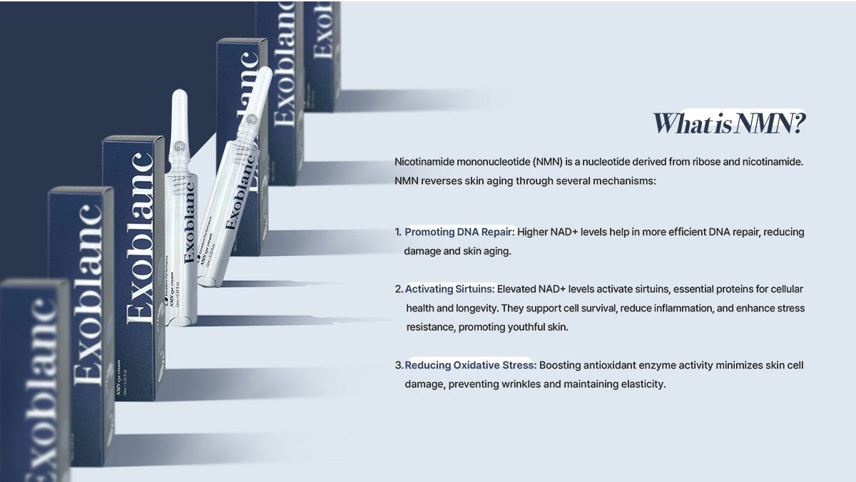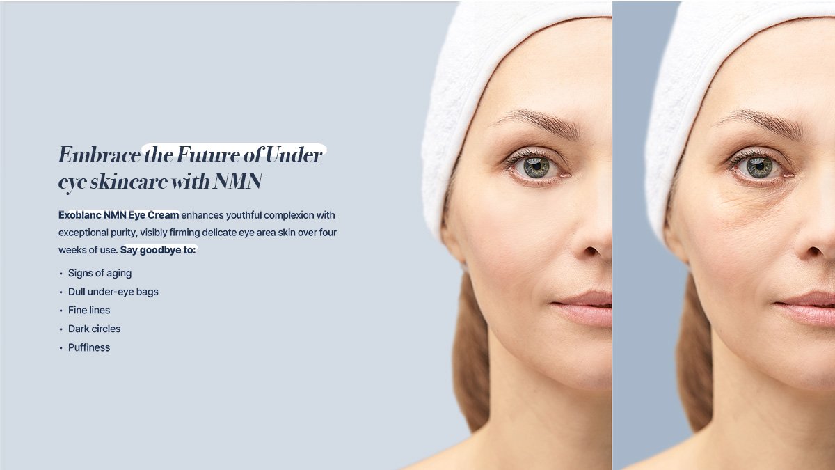 Exoblanc NMN Eye Cream is an advanced anti-aging formula designed to reduce dark circles, puffiness, and fine lines.